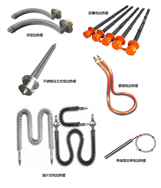 電壓可設計為:12-660V 功率為:50W-20KW 材質有:10#鐵、T4銅、1Cr18Ni9Ti不銹鋼、Ti鈦等。 規(guī)格有:U型、W型、異形、帶散熱翅片電加熱管、輻射管等,